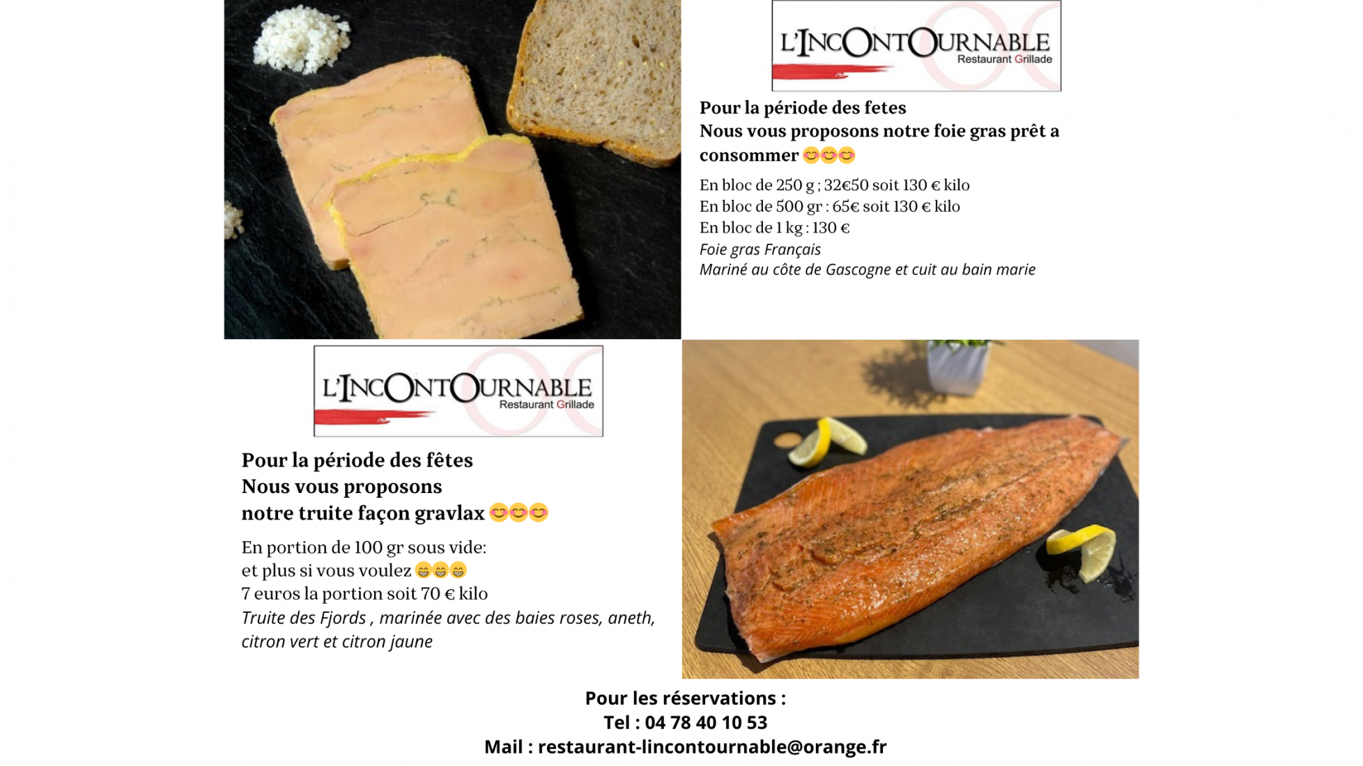 Notre Restaurant L’Incontournable est ouvert tous les midis, du lundi au samedi, et les soirs du jeudi au samedi. Venez découvrir nos viandes et poissons cuits au feu de bois dans une ambiance détendue et accueillante. Le Restaurant L’Incontournable, c’est une équipe dynamique et souriante, une salle spacieuse et une terrasse ombragée où il fait bon s’y poser.